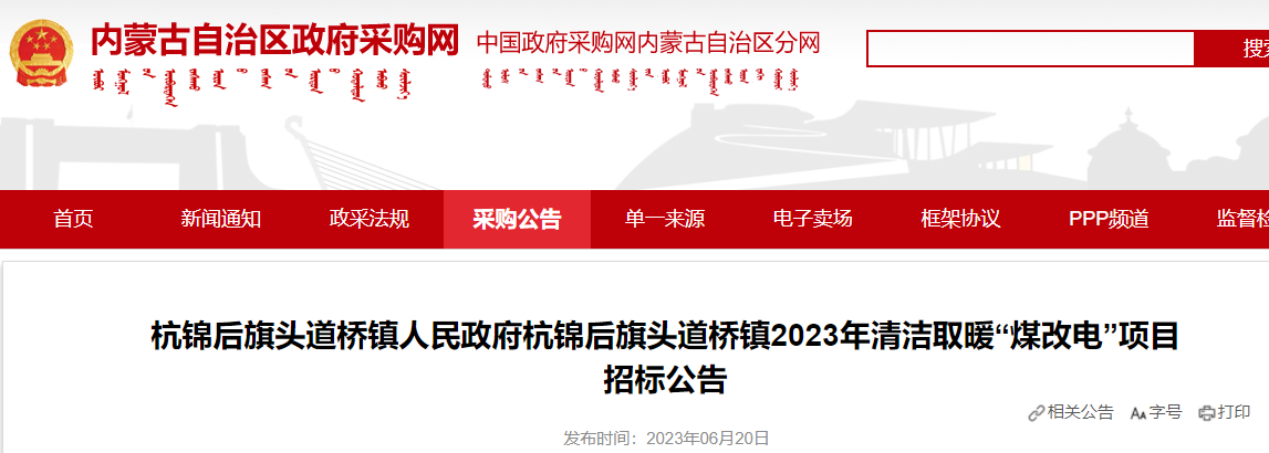 ◆杭錦后旗頭道橋鎮人民政府杭錦后旗頭道橋鎮2023年清潔取暖“煤改電”項目1007套招標公告
