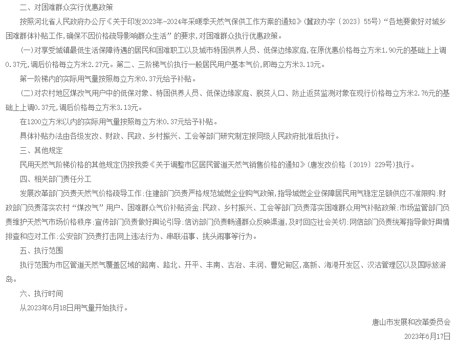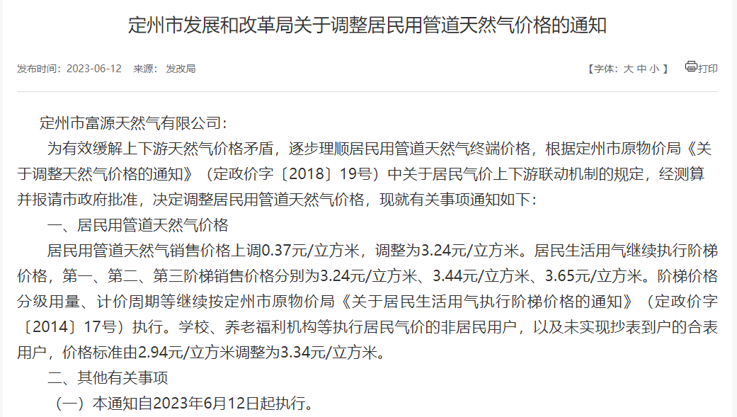 近日,河北省政府辦公廳發布《關于印發河北省2023-2024年采暖季天然氣保供工作方案的通知》(冀政辦字〔2023〕55號),石家莊、秦皇島、唐山、廊坊、定州、遷安等地區相繼上調天然氣價格,調增0.37元/立方米左右。“煤改氣”用戶費用也隨之上漲,漲至3.13元/立方米~3.15元/立方米不等。