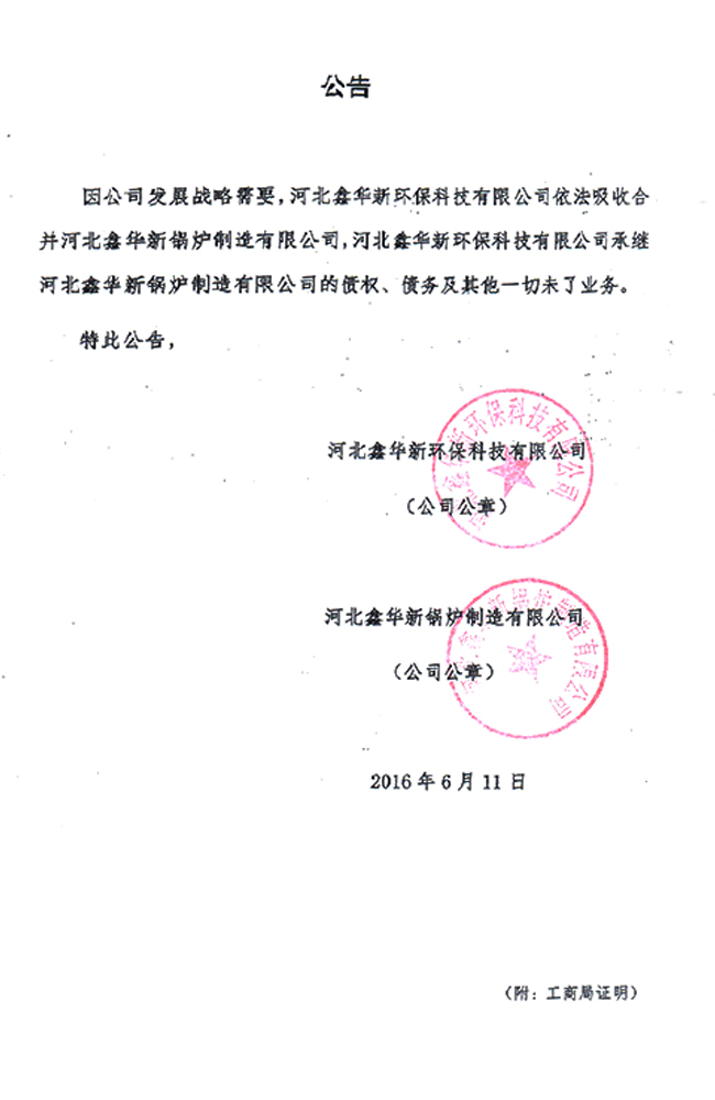 因公司戰略發展需要,河北鑫華新環保科技有限公司依法吸收合并河北鑫華新鍋爐制造有限公司,河北鑫華新環保科技有限公司承繼河北鑫華新鍋爐制造有限公司的債權、債務及其他一切未了業務。 特此公告!