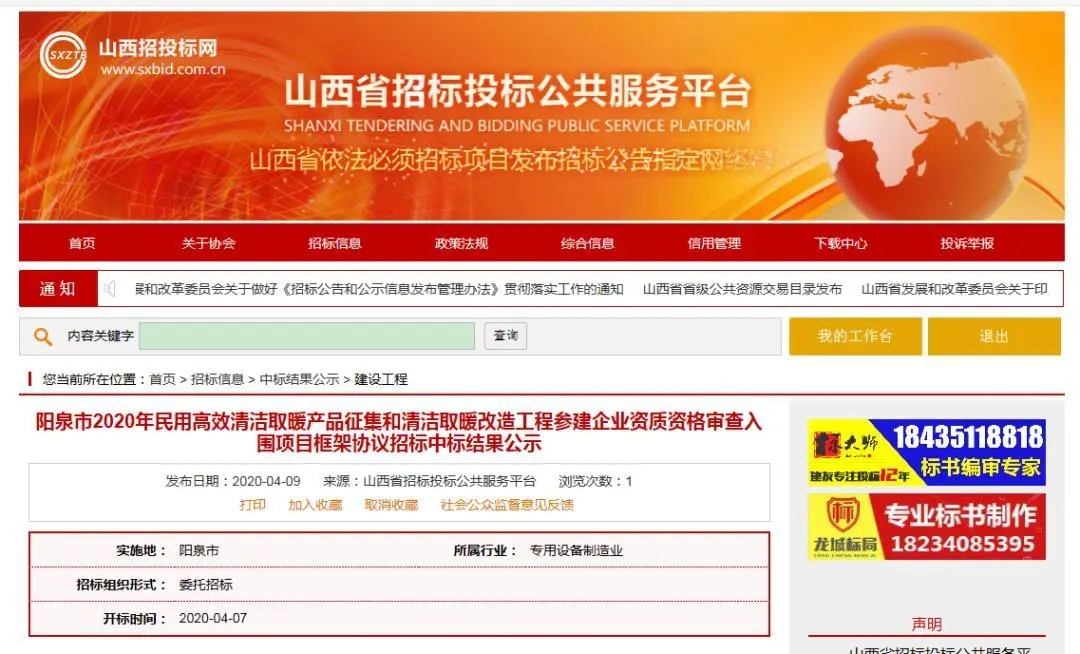 4月9日,山西陽泉市2020年民用高效清潔取暖產品征集和清潔取暖改造工程參建企業資質資格審查入圍項目中標結果公示。