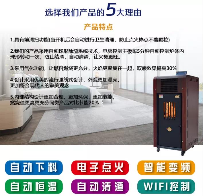 顆粒爐的前清掃功能,啟動爐子后,爐子首先進入爐膛內部的自動清掃,保證內部無灰塵,確保點火棒一次點火成功;小孔均勻覆蓋的球體是祥和顆粒爐除渣的關鍵設備,每隔五分鐘,清灰球體會自動投入運行,防止爐內結渣,燃料與空氣配合更充分,保持了燃料充分燃燒;獨有的氣化功能使火焰更聚集,燃燒更充分,熱效率提高了30%,節約了燃料成本;在爐子熄火后,爐子會自動進入15分鐘的后清掃狀態,每隔5分鐘啟動一次,有效防止回火,保證爐子的安全熄滅 。