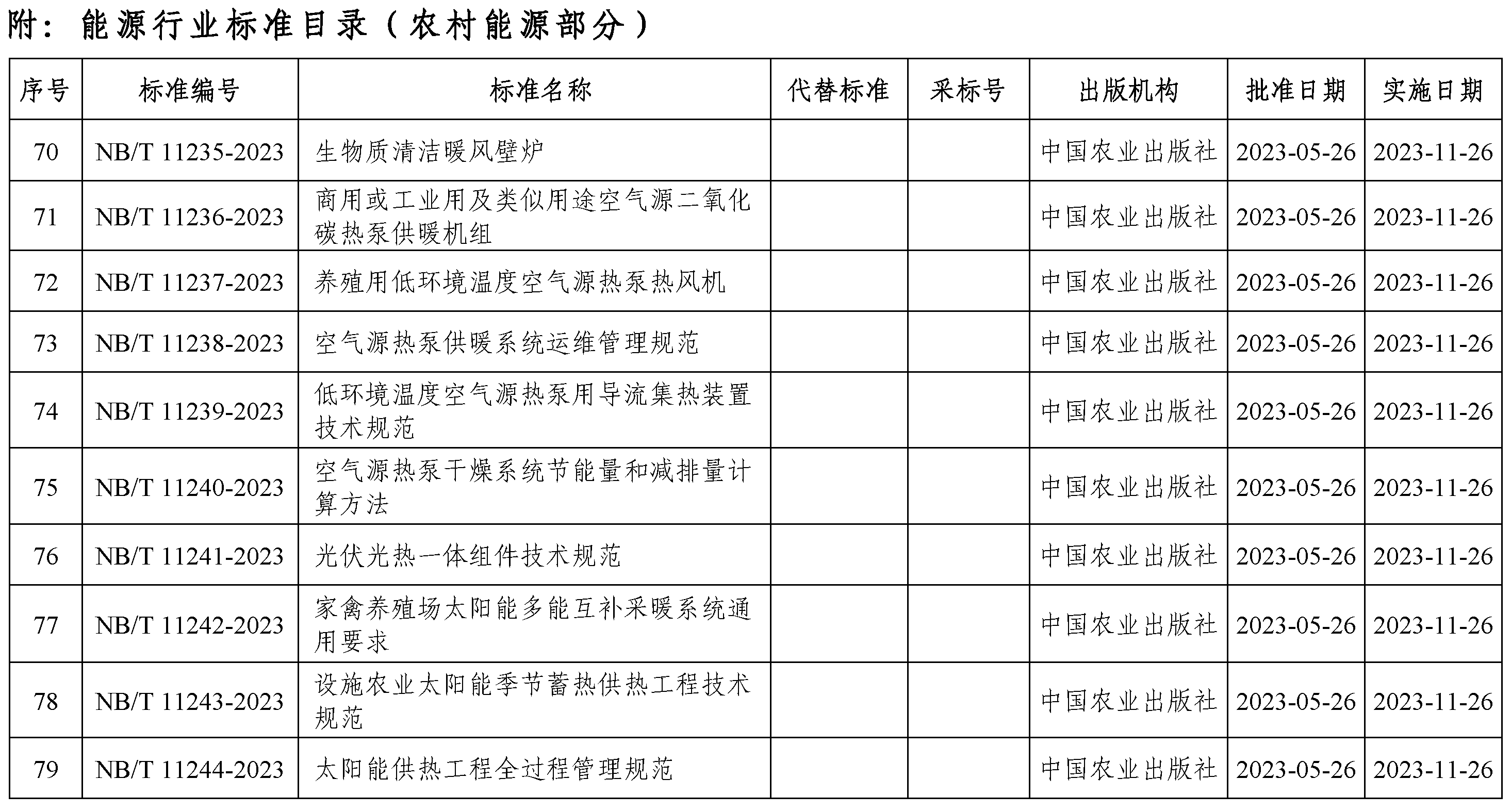 5月26日,國家能源局發布2023年第4號公告,批準了由中國農村能源行業協會和農業農村部農業生態與資源保護總站提出,能源行業農村能源標準化技術委員會歸口管理的10項行業標準,其中清潔爐具1項、空氣源熱泵5項、太陽能4項,將于2023年11月26日起實施。