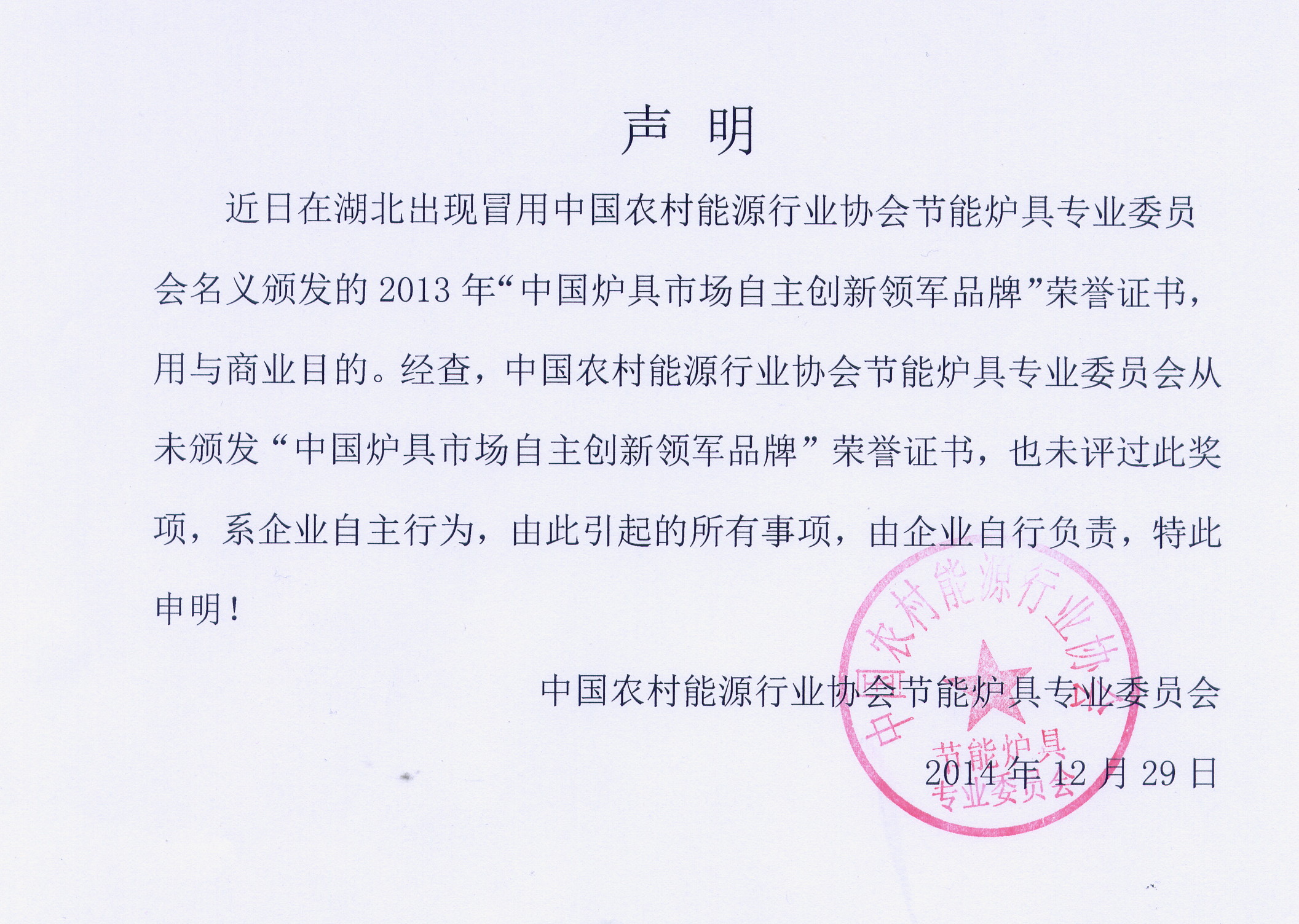 近日在湖北出現(xiàn)冒用中國農(nóng)村能源行業(yè)協(xié)會節(jié)能爐具專業(yè)委員會名義頒發(fā)的2013年“中國節(jié)能爐具自主創(chuàng)新領(lǐng)軍品牌”榮譽(yù)證書,用于商業(yè)目的。經(jīng)查,中國農(nóng)村能源行業(yè)協(xié)會節(jié)能爐具專業(yè)委員會從未頒發(fā)“中國爐具市場自主創(chuàng)新領(lǐng)軍品牌”榮譽(yù)證書,也未評過此獎項(xiàng),系企業(yè)自主行為,由此引起的所有事項(xiàng),由企業(yè)自行負(fù)責(zé),特此申明!(申明原件附后)