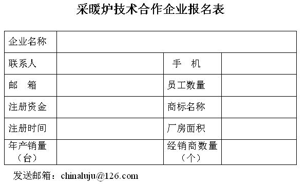 有意合作使用該項技術的企業,請填寫報名表(附后)于6月25日前發送到中國爐具網郵箱chinaluju@126.com,詳情電話咨詢010-57394008,節能爐具專委會將從報名表選擇符合條件企業,于7月初進入實施階段。