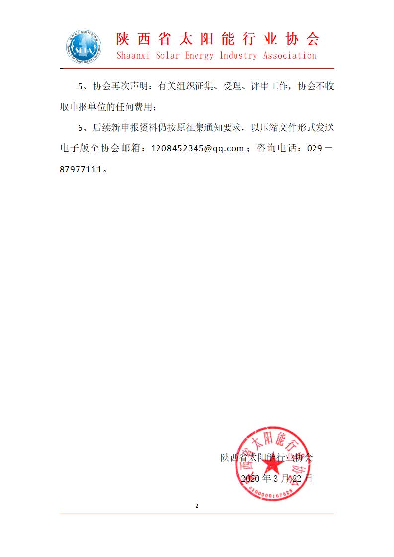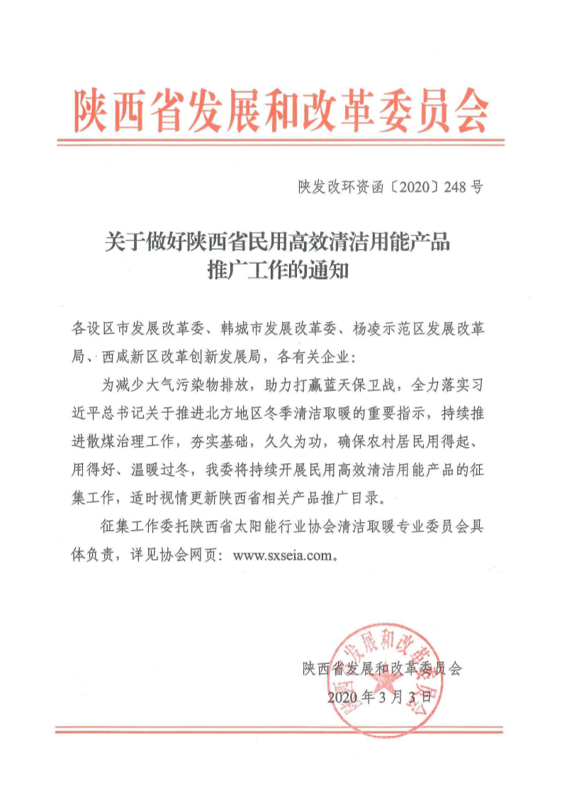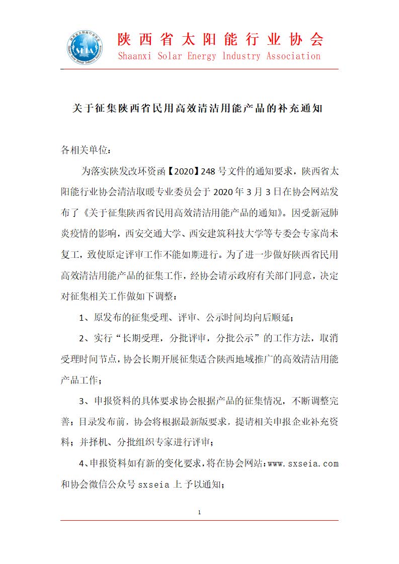 為落實(shí)陜發(fā)改環(huán)資函【2020】248號(hào)文件的通知要求,陜西省太陽(yáng)能行業(yè)協(xié)會(huì)清潔取暖專(zhuān)業(yè)委員會(huì)于2020年3月3日在協(xié)會(huì)網(wǎng)站發(fā)布了《關(guān)于征集陜西省民用高效清潔用能產(chǎn)品的通知》。因受新冠肺炎疫情的影響,西安交通大學(xué)、西安建筑科技大學(xué)等專(zhuān)委會(huì)專(zhuān)家尚未復(fù)工,致使原定評(píng)審工作不能如期進(jìn)行。為了進(jìn)一步做好陜西省民用高效清潔用能產(chǎn)品的征集工作,經(jīng)協(xié)會(huì)請(qǐng)示政府有關(guān)部門(mén)同意,決定對(duì)征集相關(guān)工作做如下調(diào)整: