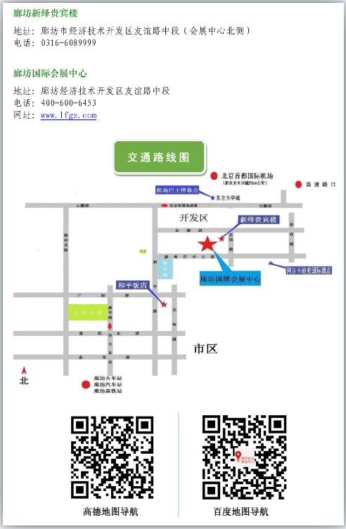 廊坊市區(qū)內(nèi)大貨車(chē)24小時(shí)限行,如參展的貨車(chē)進(jìn)入廊坊,請(qǐng)從G2高速廊坊出口出,并請(qǐng)?zhí)崆鞍衍?chē)牌號(hào)告知組委會(huì),便于協(xié)調(diào)。