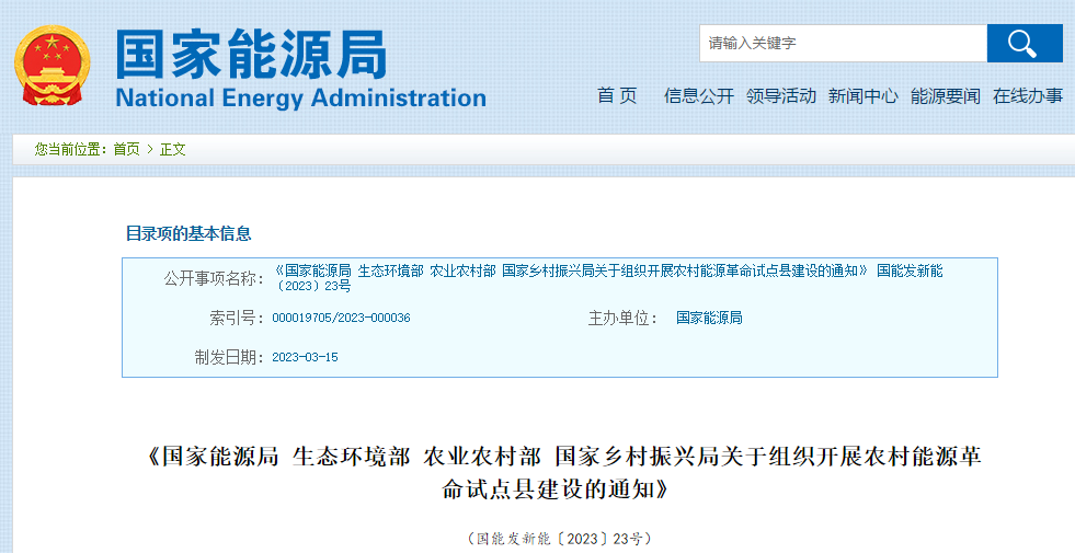 《國家能源局 生態環境部 農業農村部 國家鄉村振興局關于組織開展農村能源革命試點縣建設的通知》