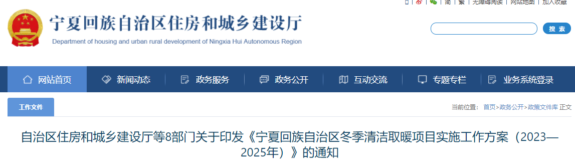 自治區住房和城鄉建設廳等8部門關于印發《寧夏回族自治區冬季清潔取暖項目實施工作方案(2023—2025年)》的通知