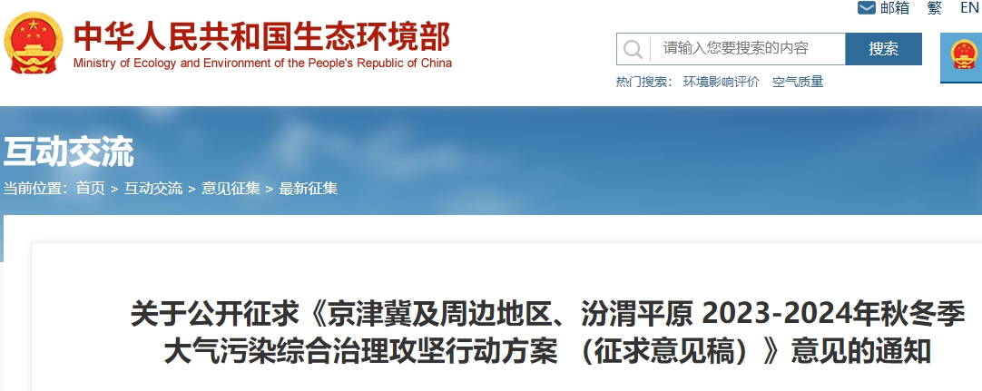 為貫徹落實《中共中央 國務院關于深入打好污染防治攻堅戰的意見》《深入打好重污染天氣消除、臭氧污染防治和柴油貨車污染治理攻堅戰行動方案》,持續改善大氣污染防治重點區域秋冬季環境空氣質量,我部起草了《京津冀及周邊地區、汾渭平原2023-2024年秋冬季大氣污染綜合治理攻堅行動方案(征求意見稿)》,現公開征求意見。征求意見稿可登錄我部網站“意見征集”欄目檢索查閱。