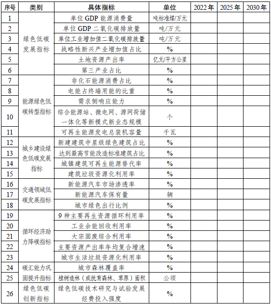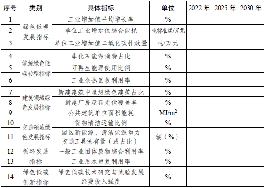 提出碳達峰試點工作的總體目標和實施路徑,明確推進碳達峰行動的路線圖、施工圖,以及重點任務舉措等。視情提出重點領域、重點行業碳達峰試點目標。可參考表1和表2列出的指標,并根據實際情況補充或刪減。