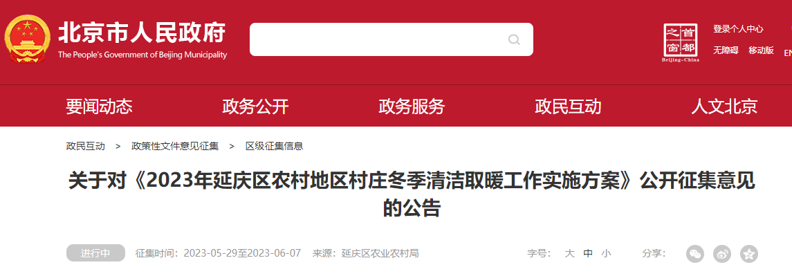 關于對《2023年延慶區農村地區村莊冬季清潔取暖工作實施方案》公開征集意見的公告