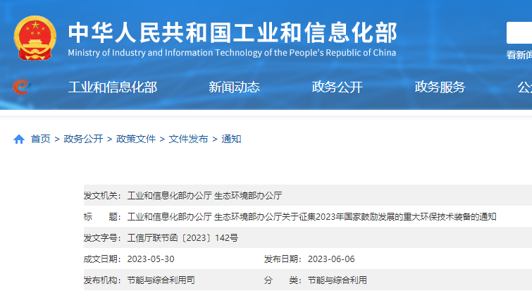 工業(yè)和信息化部辦公廳 生態(tài)環(huán)境部辦公廳關(guān)于征集2023年國(guó)家鼓勵(lì)發(fā)展的重大環(huán)保技術(shù)裝備的通知