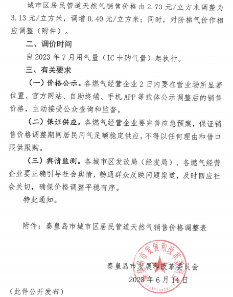 ◆秦皇島市發展和改革委員會關于聯動調整城市區居民管道天然氣銷售價格有關事項的通知