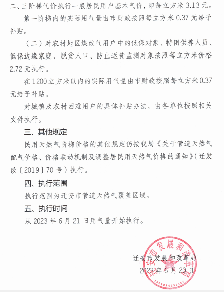 (二)對農村地區煤改氣用戶中的低保對象、特困供養人員、低保邊緣家庭、脫貧人口、防止返貧監測對象在現行價格每立方米2.76元的基礎上上調0.37元,調后價格每立方米3.13元。