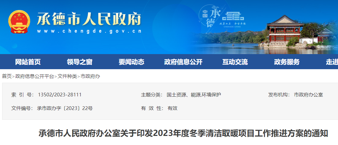 承德市人民政府辦公室關(guān)于印發(fā)2023年度冬季清潔取暖項目工作推進方案的通知