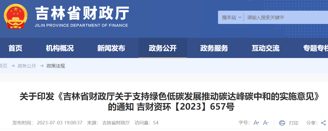 關于印發《吉林省財政廳關于支持綠色低碳發展推動碳達峰碳中和的實施意見》的通知