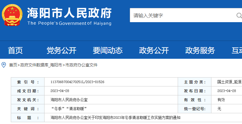 海陽市人民政府辦公室關于印發海陽市2023年冬季清潔取暖工作實施方案的通知