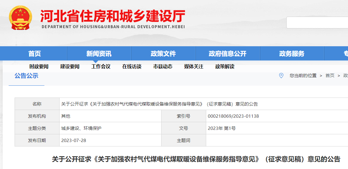 關于公開征求《關于加強農村氣代煤電代煤取暖設備維保服務指導意見》(征求意見稿)意見的公告