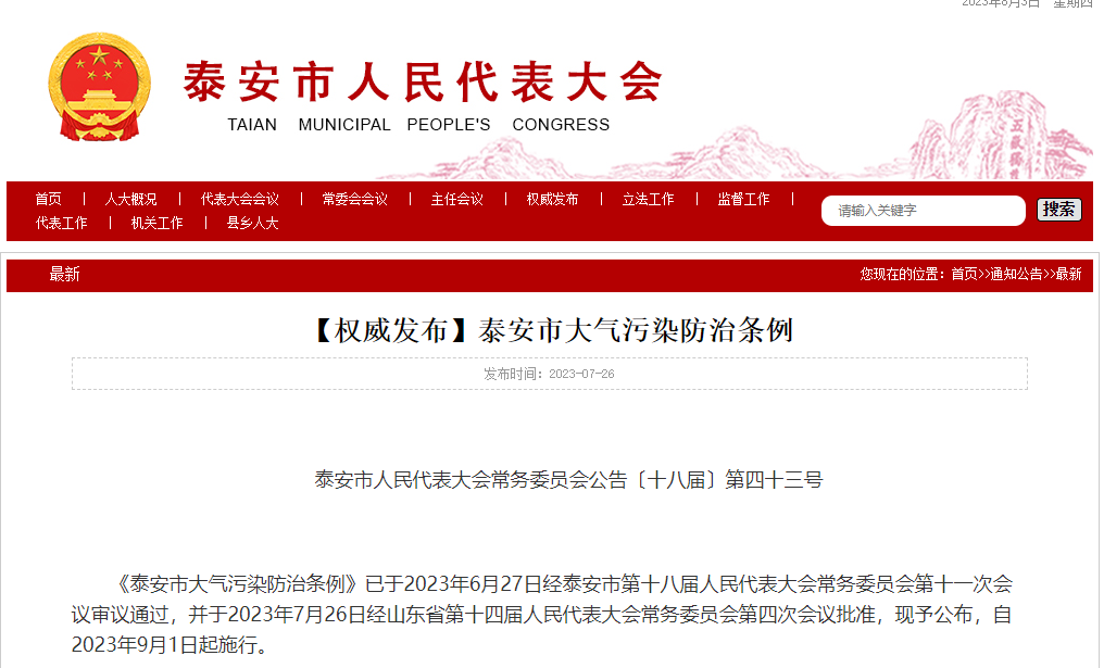 《泰安市大氣污染防治條例》已于2023年6月27日經泰安市第十八屆人民代表大會常務委員會第十一次會議審議通過,并于2023年7月26日經山東省第十四屆人民代表大會常務委員會第四次會議批準,現予公布,自2023年9月1日起施行。
