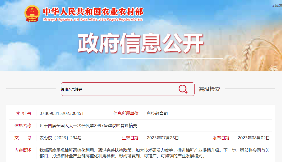 您提出的關于大力推進秸稈高值化利用的建議收悉。經商國家發展改革委、財政部,現答復如下: