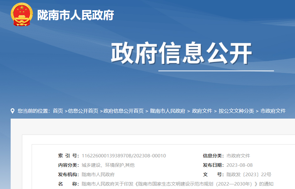 隴南市人民政府關于印發《隴南市國家生態文明建設示范市規劃(2022—2030年)》的通知