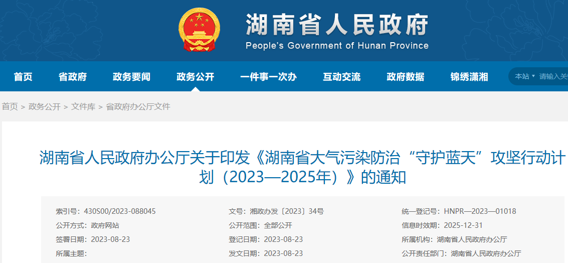 湖南省人民政府辦公廳關(guān)于印發(fā)《湖南省大氣污染防治“守護(hù)藍(lán)天”攻堅行動計劃(2023—2025年)》的通知