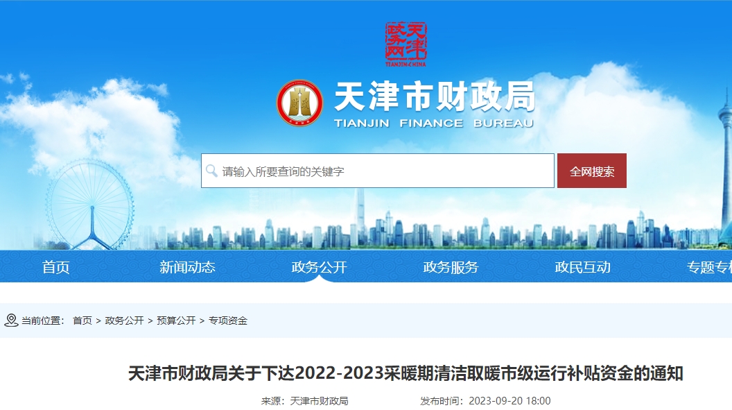 原標題:天津市財政局關于下達2022-2023采暖期清潔取暖市級運行補貼資金的通知