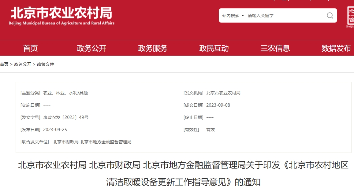 北京市農業農村局 北京市財政局 北京市地方金融監督管理局關于印發《北京市農村地區清潔取暖設備更新工作指導意見》的通知