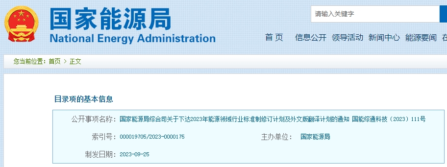 國家能源局綜合司關于下達2023年能源領域行業(yè)標準制修訂計劃及外文版翻譯計劃的通知