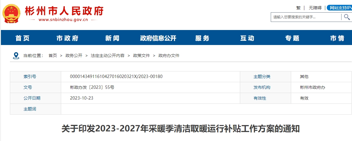 彬州市2023-2027年采暖季清潔取暖運行補貼工作方案