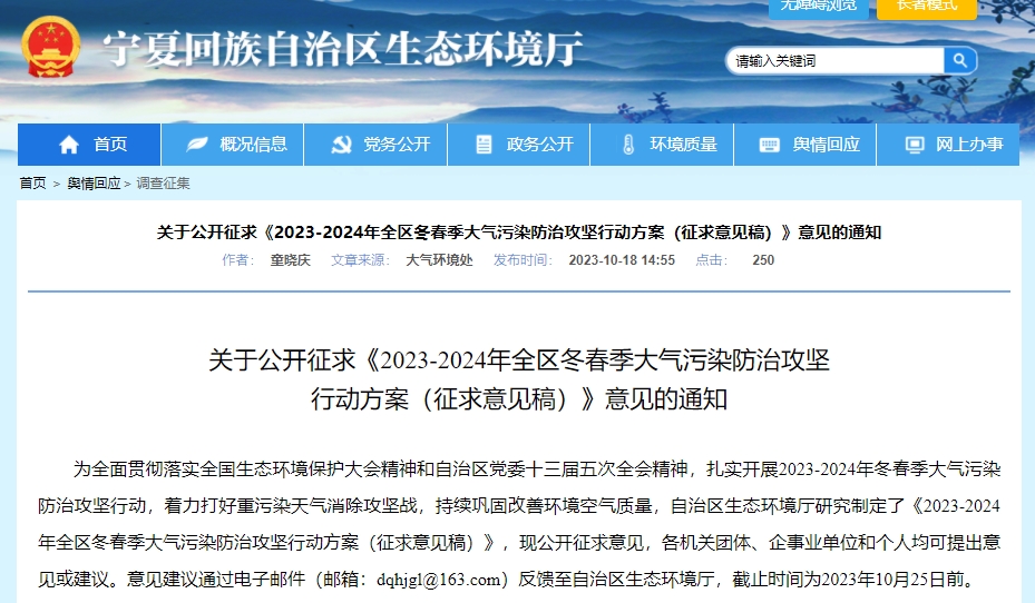 為全面貫徹落實全國生態環境保護大會精神和自治區黨委十三屆五次全會精神,扎實開展2023-2024年冬春季大氣污染防治攻堅行動,著力打好重污染天氣消除攻堅戰,持續鞏固改善環境空氣質量,自治區生態環境廳研究制定了《2023-2024年全區冬春季大氣污染防治攻堅行動方案(征求意見稿)》,現公開征求意見,各機關團體、企事業單位和個人均可提出意見或建議。意見建議通過電子郵件(郵箱:dqhjgl@163.com)反饋至自治區生態環境廳,截止時間為2023年10月25日前。