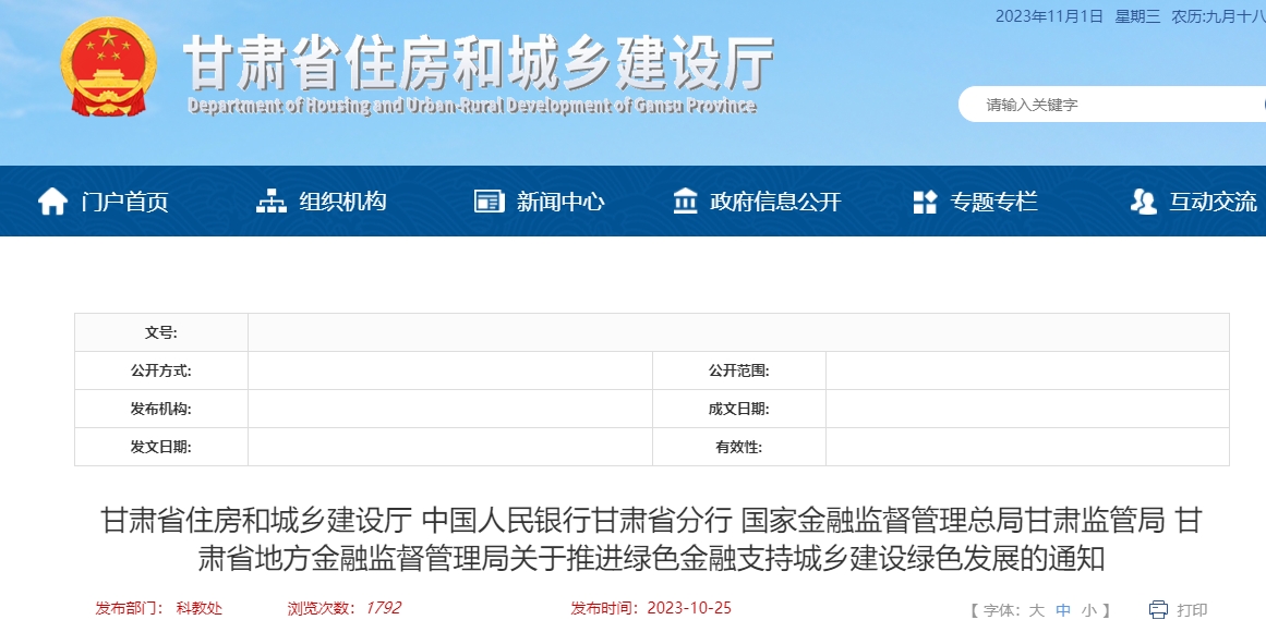 甘肅省住房和城鄉建設廳、中國人民銀行甘肅省分行、國家金融監督管理總局甘肅監管局、甘肅省地方金融監督管理局關于推進綠色金融支持城鄉建設綠色發展的通知