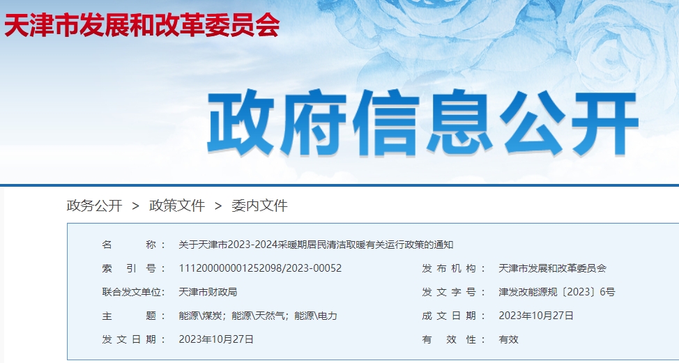 關于天津市2023-2024采暖期居民清潔取暖有關運行政策的通知