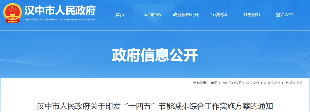 漢中市人民政府關于印發(fā)“十四五”節(jié)能減排綜合工作實施方案的通知
