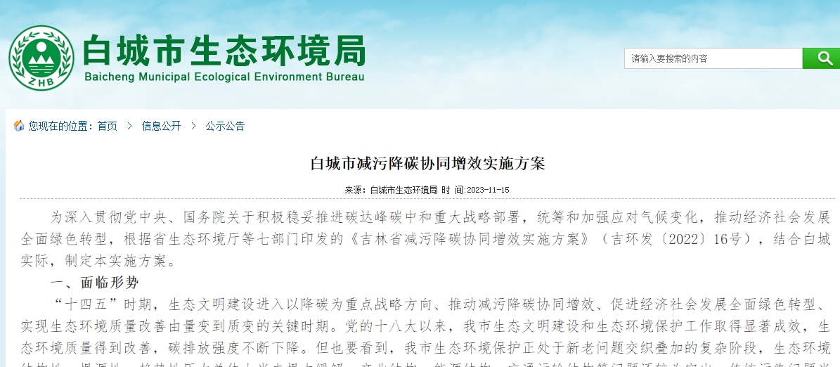 為深入貫徹黨中央、國務院關于積極穩妥推進碳達峰碳中和重大戰略部署,統籌和加強應對氣候變化,推動經濟社會發展全面綠色轉型,根據省生態環境廳等七部門印發的《吉林省減污降碳協同增效實施方案》(吉環發〔2022〕16號),結合白城實際,制定本實施方案。