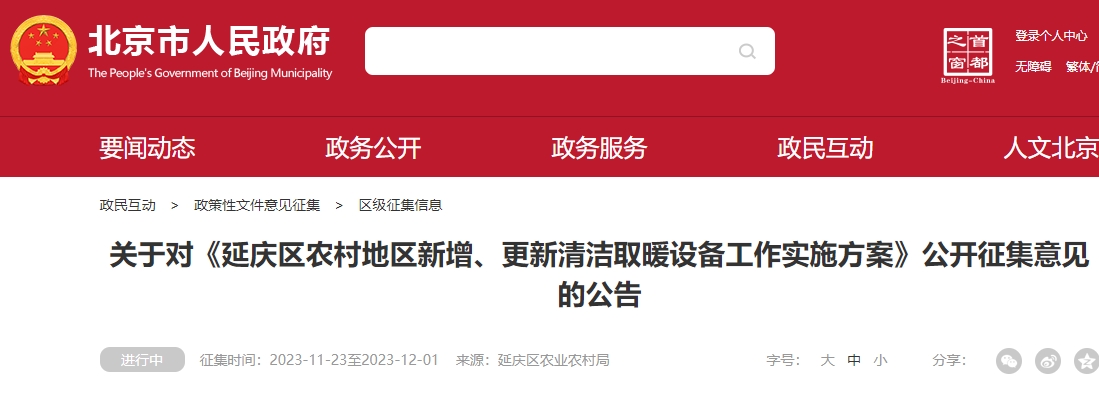關于對《延慶區農村地區新增、更新清潔取暖設備工作實施方案》公開征集意見的公告