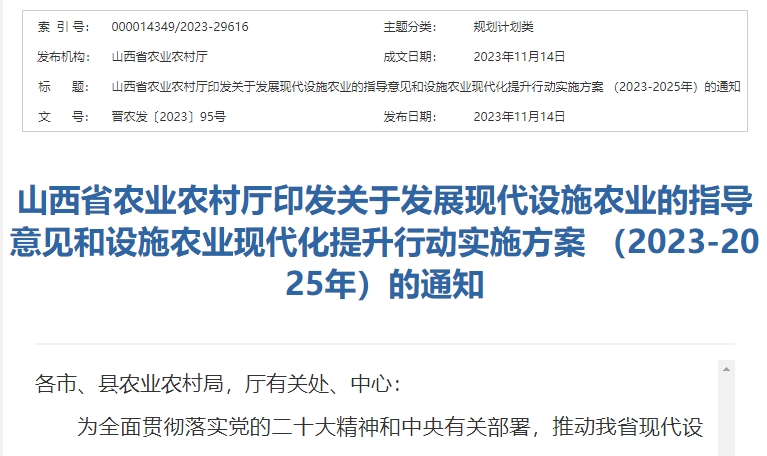 山西省農(nóng)業(yè)農(nóng)村廳印發(fā)關(guān)于發(fā)展現(xiàn)代設(shè)施農(nóng)業(yè)的指導(dǎo)意見和設(shè)施農(nóng)業(yè)現(xiàn)代化提升行動(dòng)實(shí)施方案 (2023-2025年)的通知