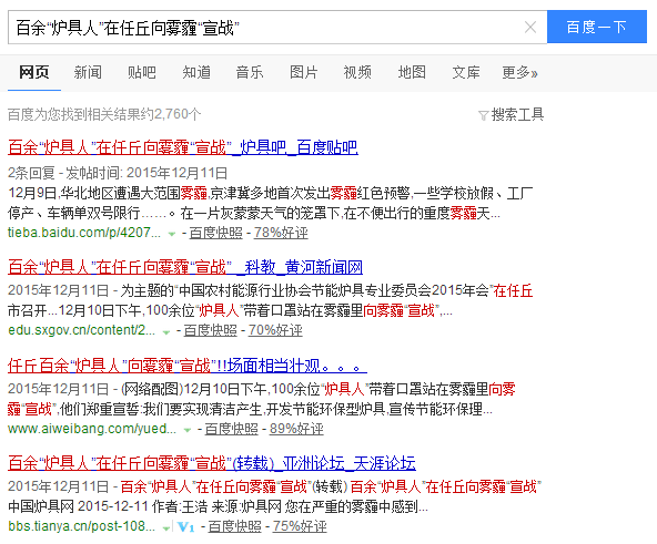 據悉,2015年12月10日,來自全國各地的百余名“爐具人”在河北任丘站在重霾中鄭重宣誓:“我們要實現清潔產生,開發節能環保型爐具,宣傳節能環保理念,引導清潔能源消費。環保心•藍天夢,‘爐具人’在行動!”。
