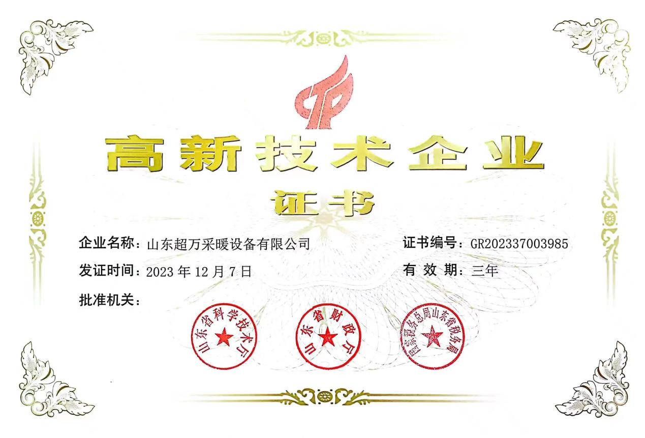新年伊始,超萬采暖設(shè)備有限公司迎來喜訊!經(jīng)過山東省科學(xué)技術(shù)廳等部門的評審,該公司被認(rèn)定為山東省高新技術(shù)企業(yè)(高企編號GR202337003985),正式跨入高新技術(shù)企業(yè)行列。