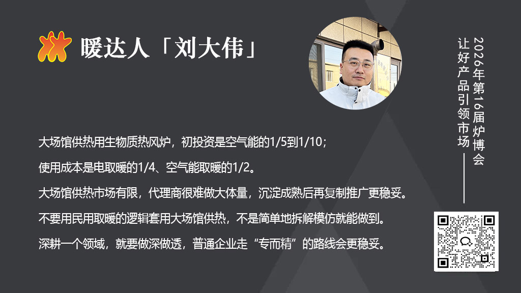 其實大場館市場目標群體并不大甚至說很小,跟民用取暖市場比起來,就是很小很細分的一個市場。目前很多同行可能覺得市場挺大,從民用爐轉(zhuǎn)型進入。這個領(lǐng)域的客戶都非常理性,絕大部分是企業(yè)或球館經(jīng)營者,他們有著較高的認知。決策周期也很長,我們有談了5年才下單的客戶。所以不像民用取暖領(lǐng)域簡單地拆解模仿就能做的。這個領(lǐng)域,特別是6年前我們剛進入時,是完全以拓荒者的角色進入,整個市場沒有成熟經(jīng)驗可借鑒,沒有前人指導,全靠自己一步步踩坑積累經(jīng)驗,在過程中不斷打磨產(chǎn)品及技術(shù),不斷完善落地解決方案,也交了很多學費。建議新進入的同行朋友不要操之過急,先打磨好產(chǎn)品,做好成功案例積累,不要用民用爐的邏輯套大場館應用產(chǎn)品。我們現(xiàn)在選代理商也很謹慎,會考量他們的落地解決能力,求穩(wěn)不求快。對企業(yè)來說,我主張要深耕一個領(lǐng)域,就要做深做透,人的精力和企業(yè)資源有限,普通企業(yè)走“專而精”的路線會更穩(wěn)妥。