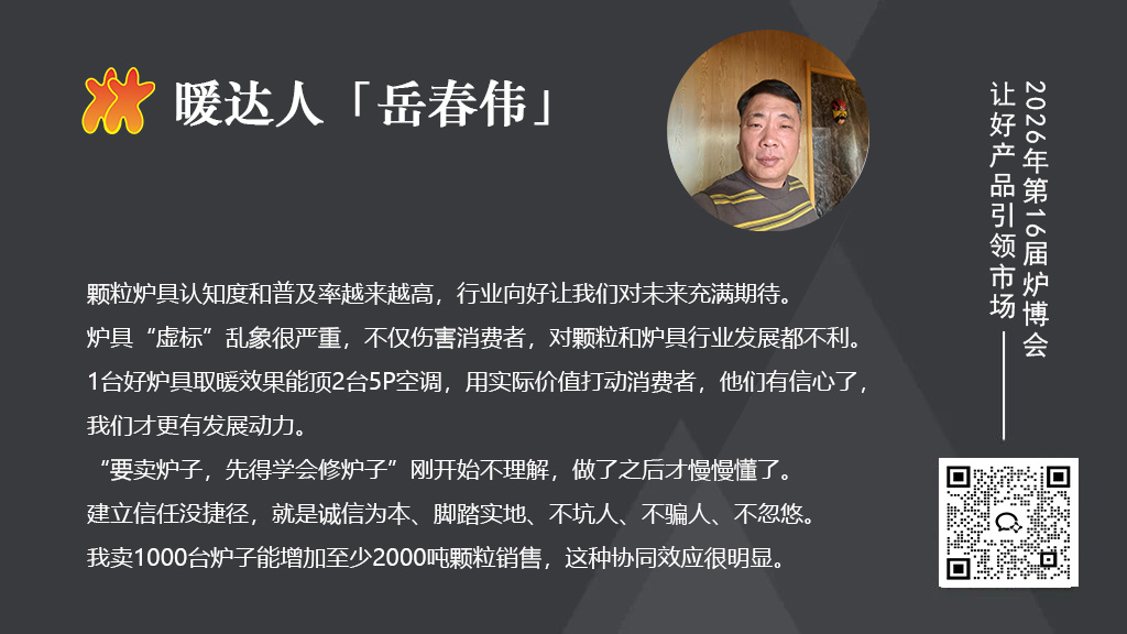 我個人最大的感受是,普通消費者對顆粒爐具的認知度和普及率越來越高,這對顆粒行業(yè)和爐具行業(yè)來說都是好事,意味著消費者從心里開始接受這種取暖方式,這是整個行業(yè)向好發(fā)展的重要信號,也讓我們對未來充滿期待。