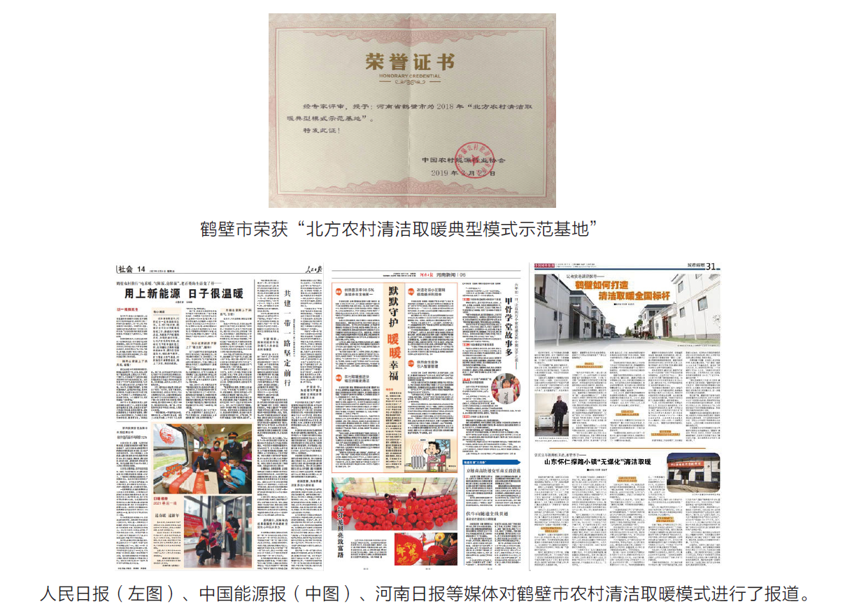 三是清潔取暖工程碩果累累。2019年被授予“北方農村清潔取暖試點典型模式示范基地”。參編《河南省農房建筑能效提升導則》,獲批2019年河南省建設科技進步一等獎。《人民日報》《建筑科技》《中國建設報》《河南日報》等權威媒體先后推薦或報道“鶴壁模式”。