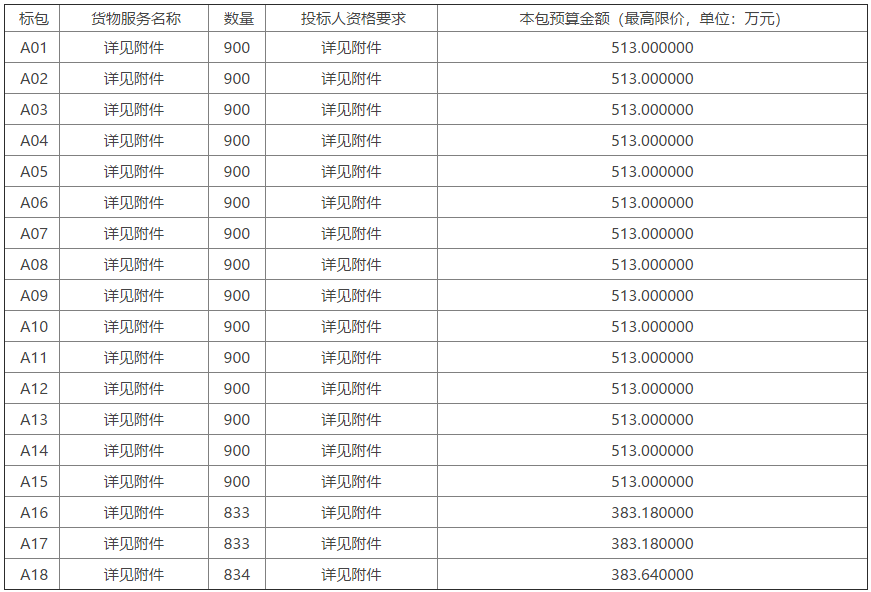 A01 - A15 包采購單臺名義制熱量 3KW 及以上空氣源熱泵熱風機、單臺名義制熱量 4KW 及以上空氣源熱泵熱風機,采購預算單價 5700 元/臺,每包預算為513 萬元左右。