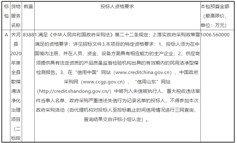 齊河縣2020年度全縣散煤清潔凈化治理項目(二標段)公開招標公告
