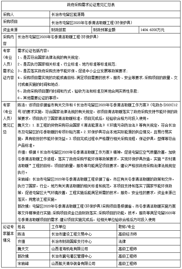 山西中盛卓遠工程項目管理有限公司受長治市屯留區能源局委托就長治市屯留區2020年冬季清潔取暖工程(環保爐具)進行需求論證,于2020年11月17日組織專家對該項目需求進行了論證,現將現有關情況公示如下: